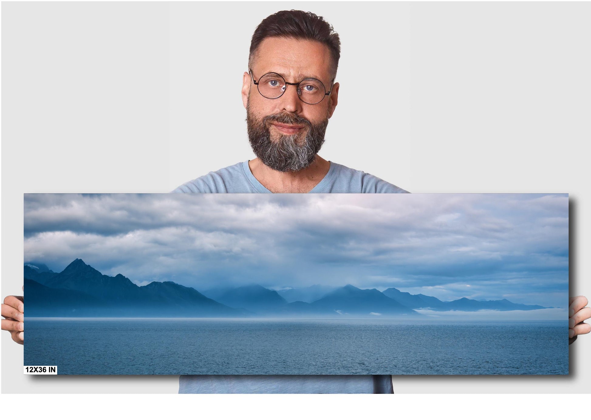 Bring the serene beauty of Alaska's Inside Passage into your space with this fine art print of misty mountains emerging through a calm seascape. This tranquil scene captures the quiet mystery of the fog-shrouded peaks, where land and water meet under a moody sky. The Inside Passage, known for its stunning fjords and islands, is a passage rich with natural history and is frequented by whales, eagles, and other wildlife, making it a majestic part of Alaska's coastal scenery.