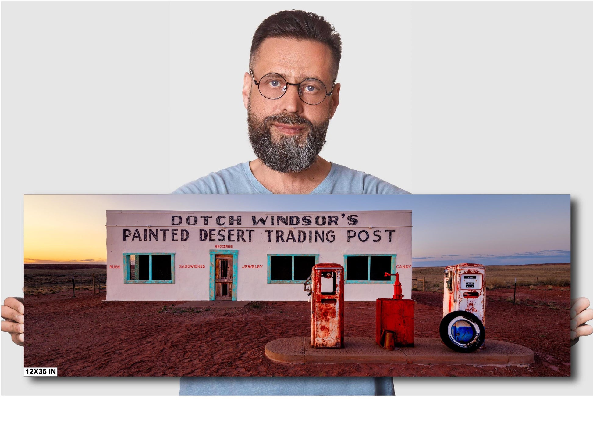 The trading post stood quietly against the sprawling desert, its white facade now tinged with twilight’s purples and blues. The air was cool, carrying a mix of desert sage and earth, while a deep, tranquil silence blanketed the land. The faded lettering above read “Dotch Windsor’s Painted Desert Trading Post,” a remnant of an era when travelers would stop here for supplies, gas, and perhaps a slice of adventure on their westward journey. The worn-out gas pumps and weathered whitewall tire added to the sense of time passing, making it feel as though I was the only soul to visit in years.