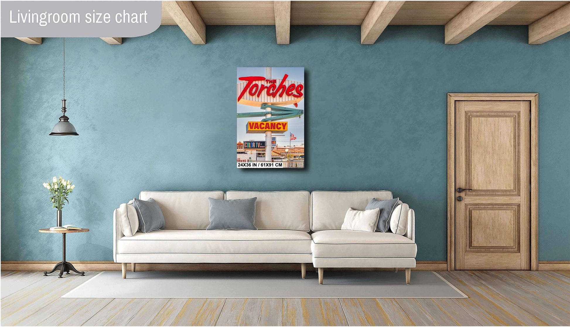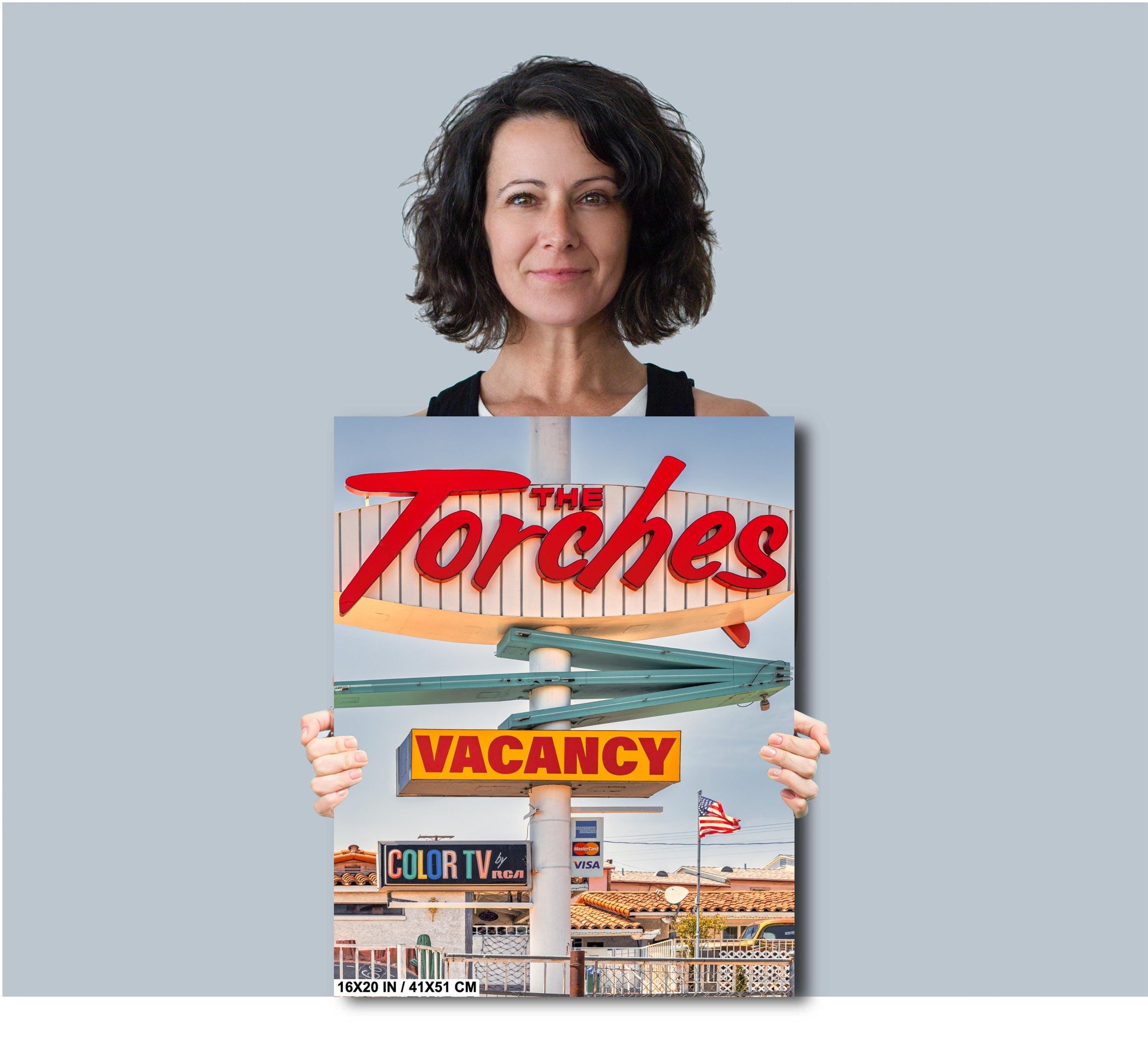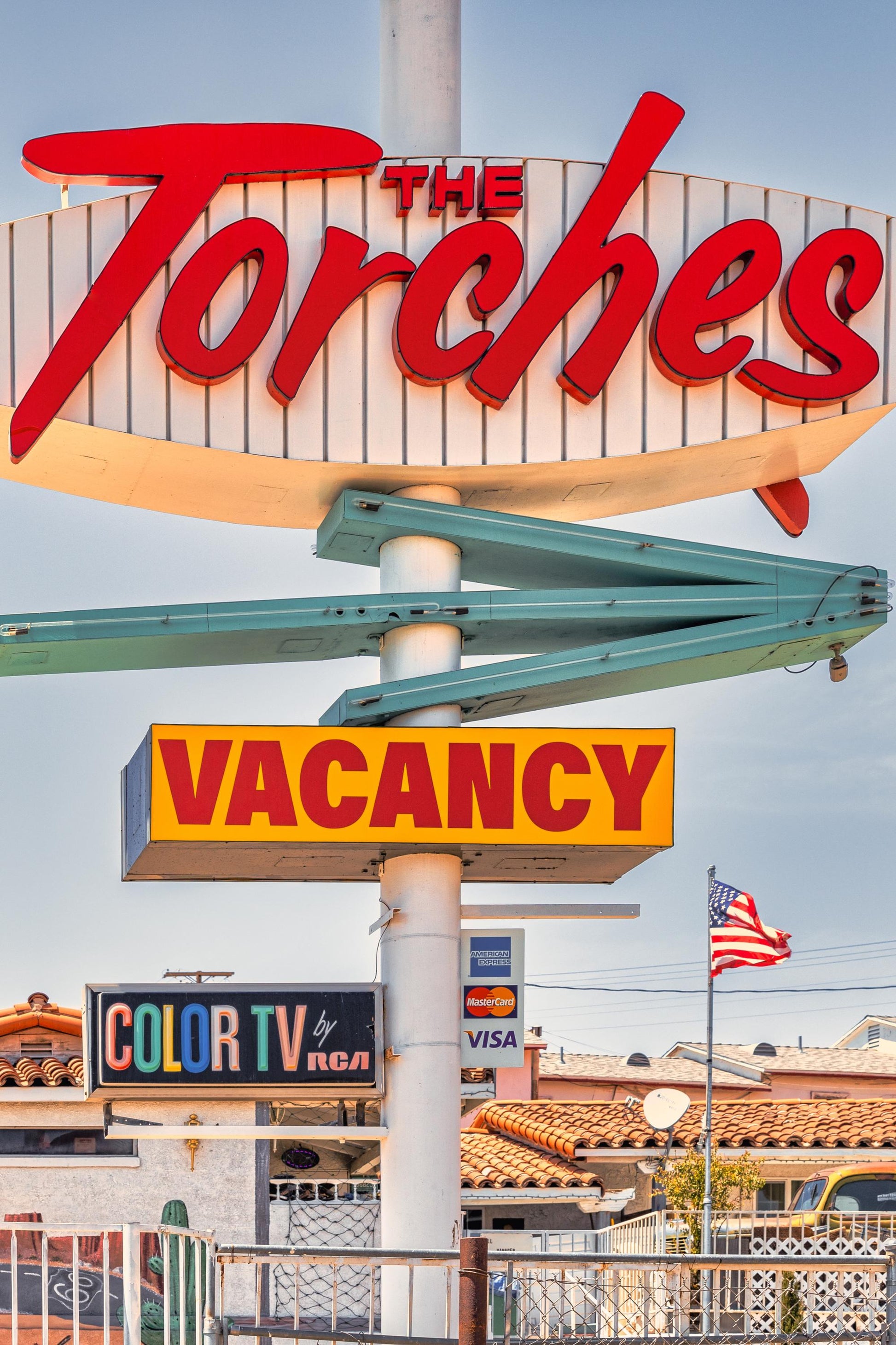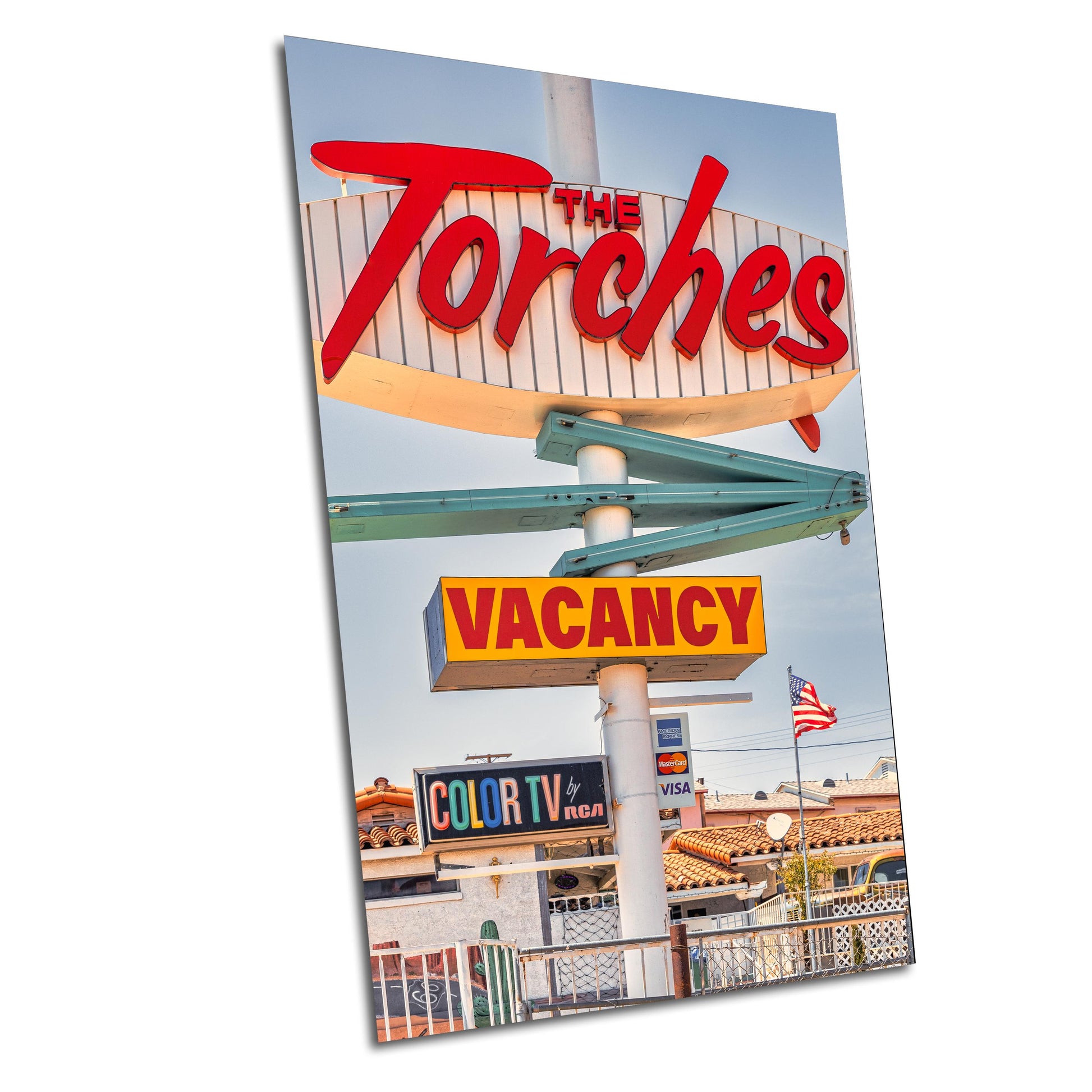 This fine art print captures the iconic Torches Motel sign in Barstow, California, located along the historic Route 66. This classic roadside sign, with its bold red "Torches" lettering and vintage "Color TV by RCA" add-on, harks back to the golden age of American road trips during the 1950s and 60s.
