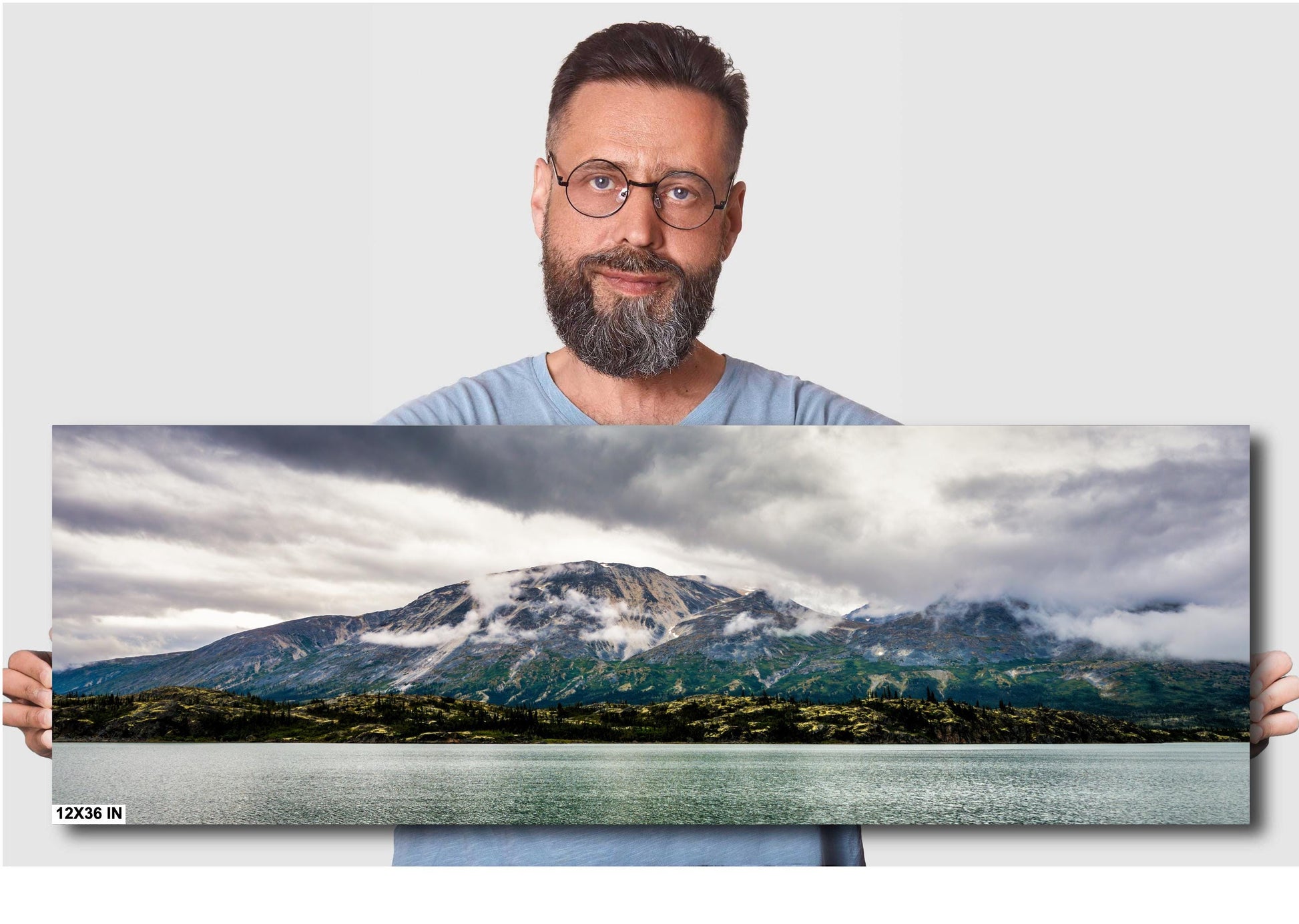 This fine art print captures the serene beauty of Bernard Lake, located at the Fraser, British Columbia, train station. Framed by misty clouds and rugged mountains, this image showcases the tranquil waters and dramatic skies of the region. Bernard Lake lies near the Canadian border along the famous White Pass & Yukon Route Railway, a significant path used during the Klondike Gold Rush.