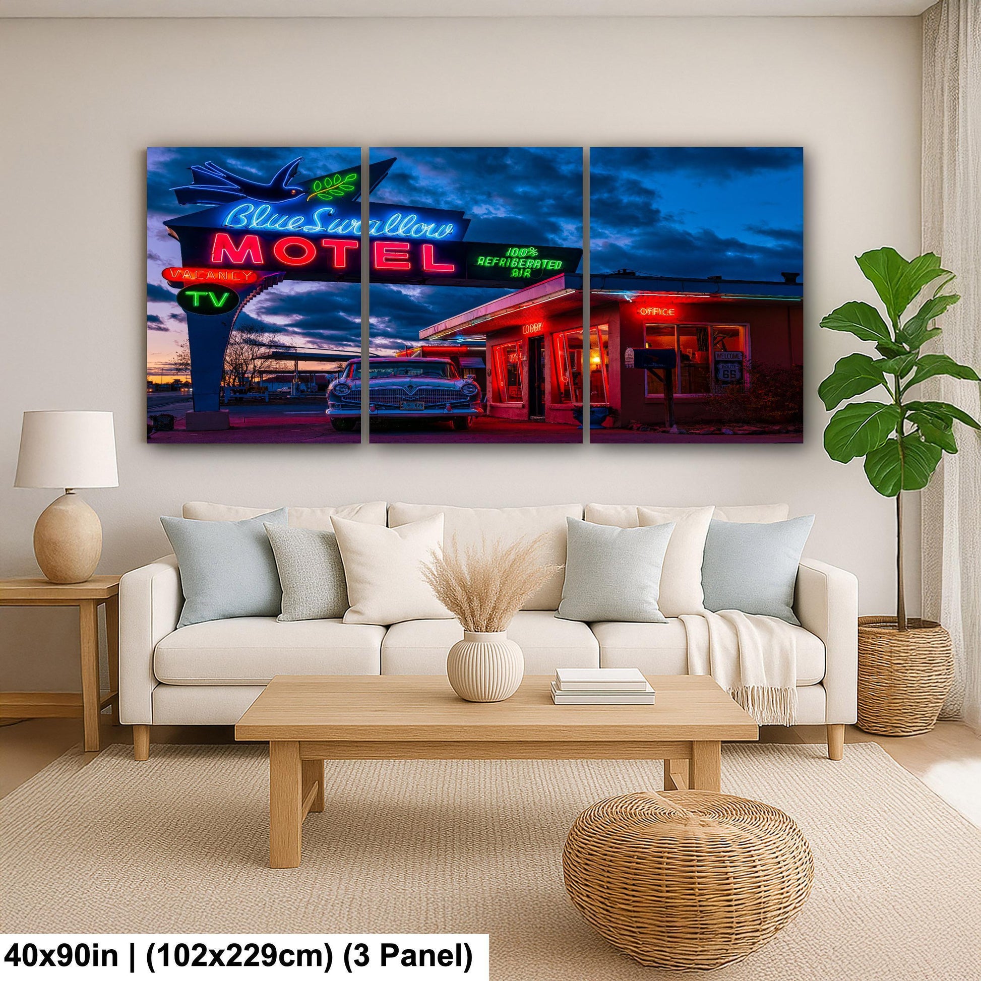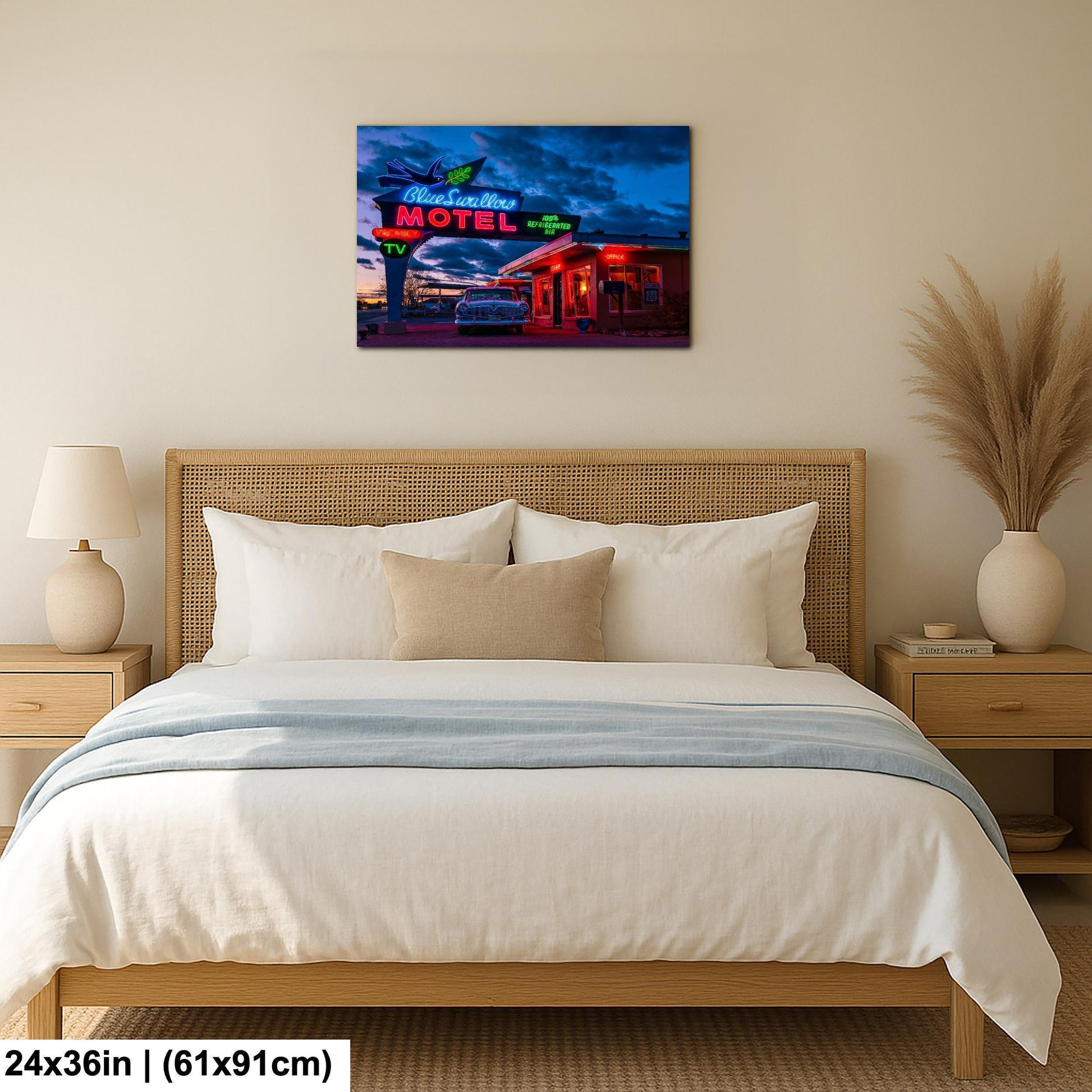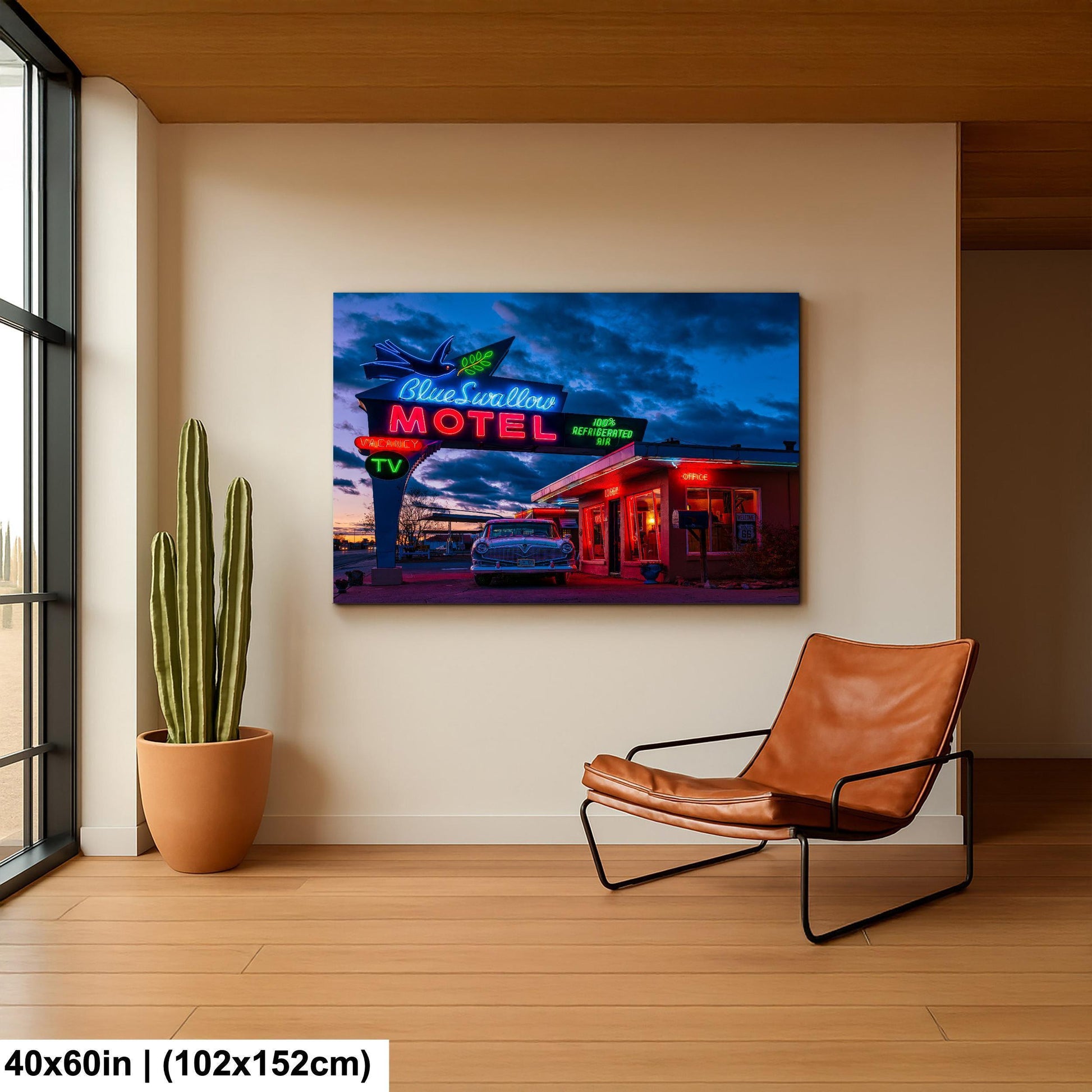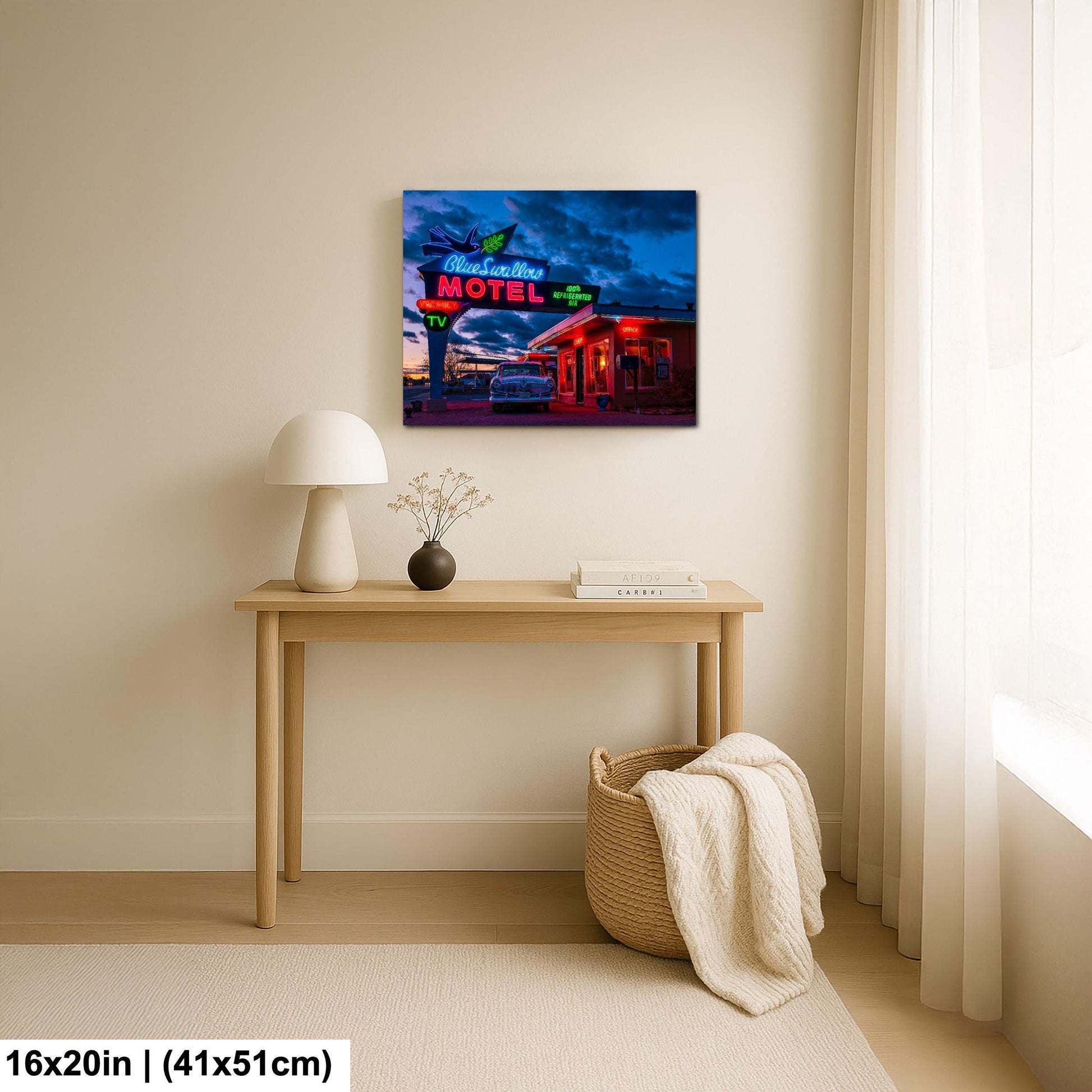 Bring home a piece of Route 66 wall art that blends nostalgia with quality craftsmanship. Whether displayed in your living room, office, or travel-themed space, this Blue Swallow Motel print adds authentic Americana neon sign charm and retro roadside decor flair that collectors and enthusiasts will appreciate.
