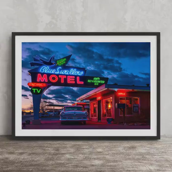 Each print is produced with care, ensuring the neon lights and desert night hues of this historic motel are faithfully rendered. The Blue Swallow Motel print not only serves as an eye-catching road trip photo print but also as a cherished reminder of America’s iconic Mother Road.