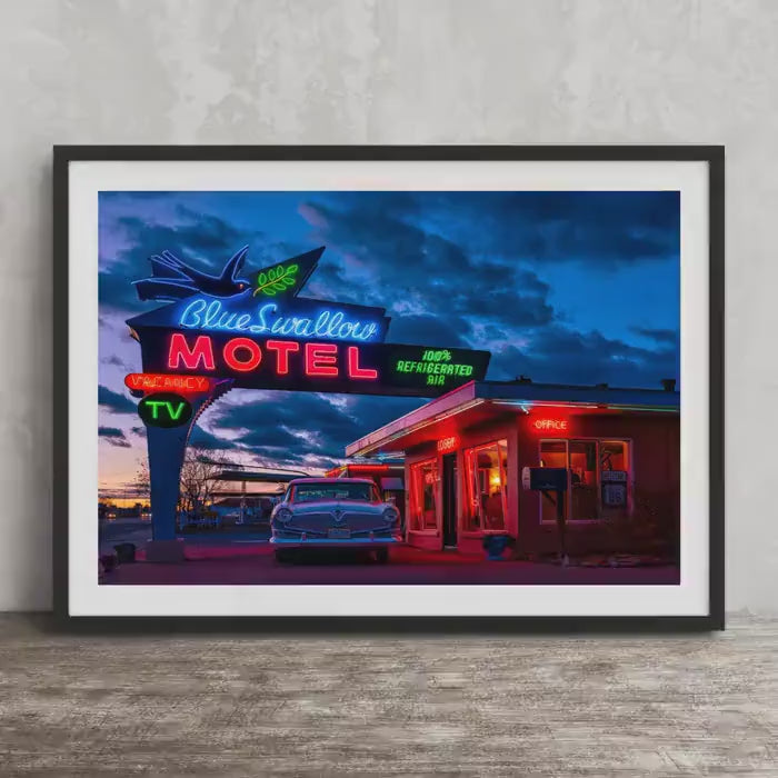 Blue Swallow Motel Print - Route 66 Wall Art | Americana Neon Sign Decor