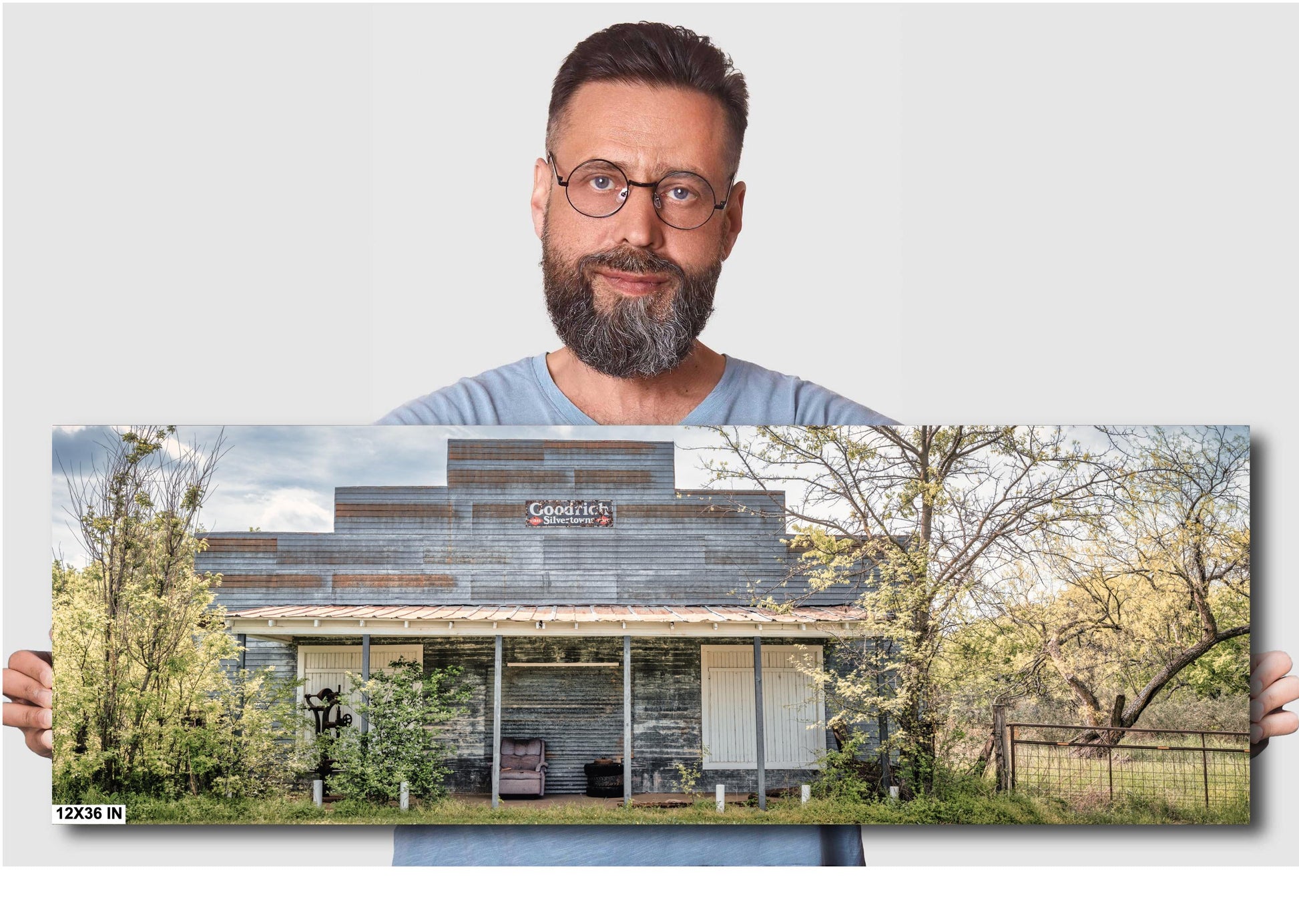 It was here that we stumbled upon a gem—a weathered old store, its tin exterior shimmering faintly under the midday sun. The sign above read "Goodrich Silvertowns," a nostalgic nod to a bygone era. The building stood stoically, flanked by overgrown trees that framed it like nature’s own portrait. My son, always eager to spot the next subject, was the first to point it out. “Dad, look! That’s the coolest building yet!”