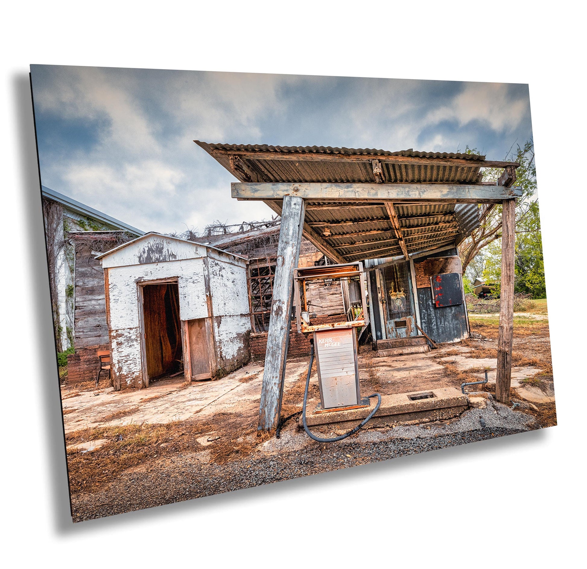 Gas Station Decor - Rustic Abandoned Gas Station in Iredell, Texas | Premium Quality or Ready-to-Hang Canvas, Acrylic & Metal Options