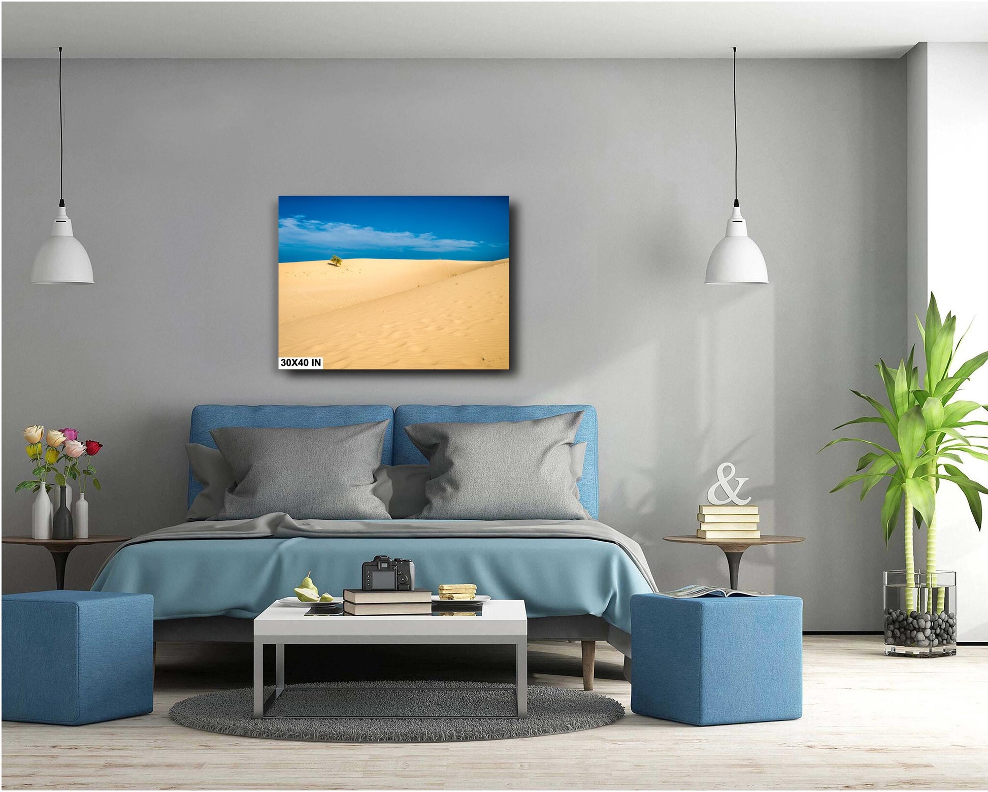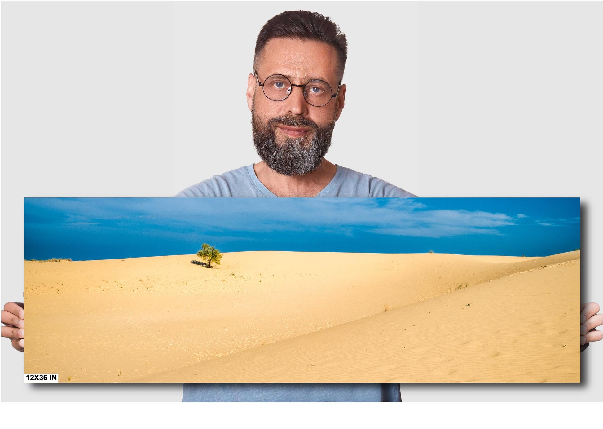 Capture the serene beauty of the vast Texas desert with this fine art print of Monahans Sandhills State Park. The golden dunes stretch endlessly beneath a vibrant blue sky, with a lone tree standing resilient in the open landscape. This image evokes the peaceful solitude and striking simplicity of the desert, perfect for those who appreciate minimalist, natural beauty.