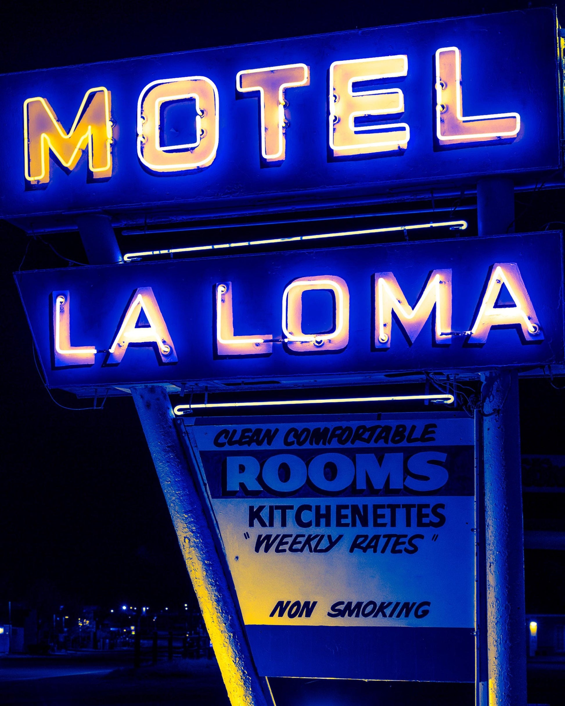 Capture a moment in time with this striking photograph of the iconic La Loma Motel neon sign in Santa Rosa, New Mexico. Bathed in deep blue and yellow hues, this vintage sign tells the story of the bygone era of Route 66 travel. La Loma Motel has long stood as a beacon for weary travelers along the historic highway, promising "clean comfortable rooms" and the charm of kitchenette accommodations with weekly rates.