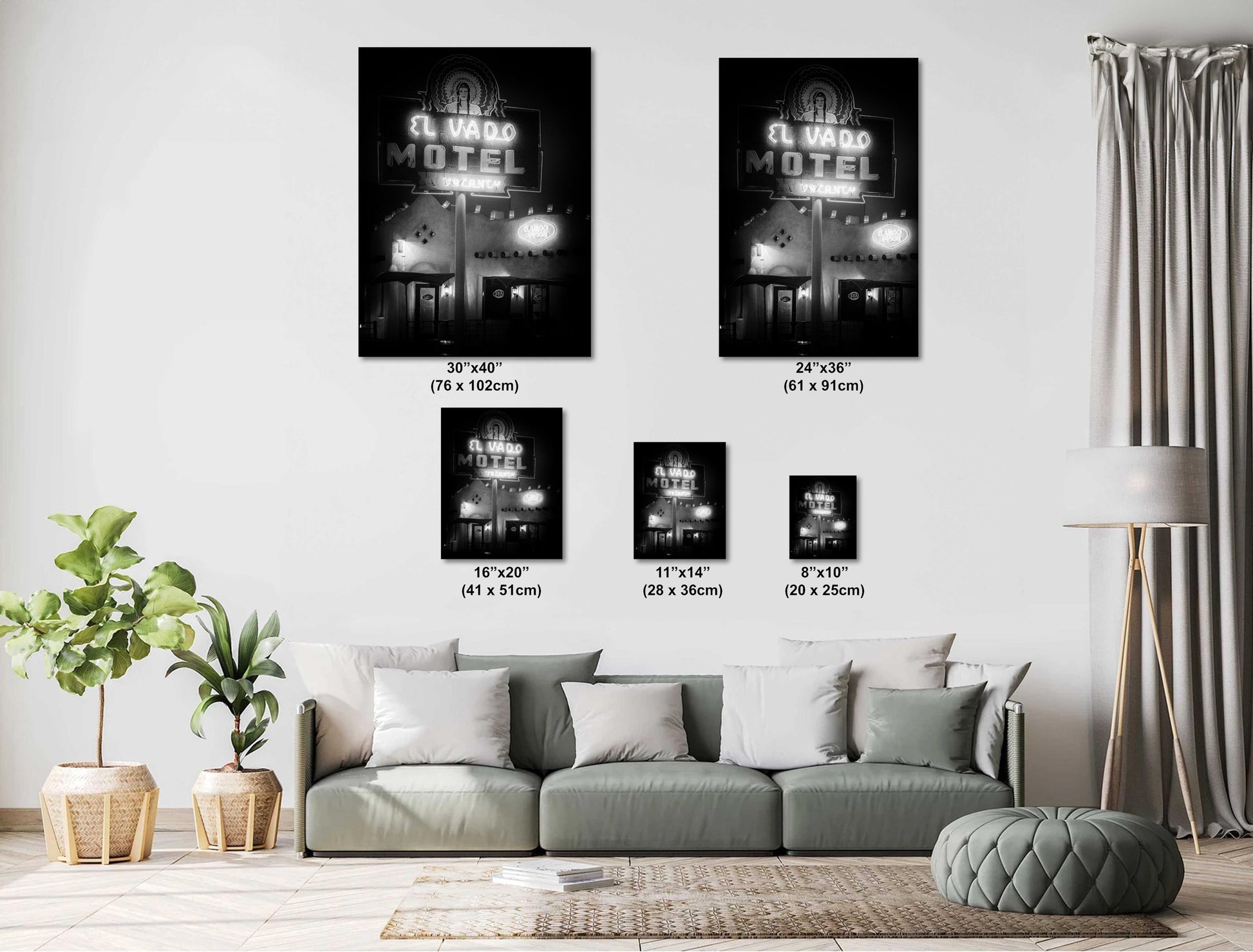 Take home a piece of Route 66 nostalgia with this fine art print of the historic El Vado Motel in Albuquerque, New Mexico. Originally opened in 1937, El Vado is one of the original Route 66 motor courts, providing travelers with a unique and authentic southwestern experience. This beautiful neon-lit landmark has been fully restored, preserving its charm and character that have welcomed road-weary travelers for decades.
