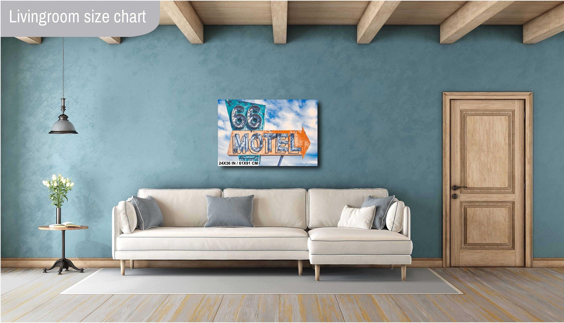 Bring a piece of classic Route 66 nostalgia into your home with this vibrant photograph of the iconic 66 Motel sign in Needles, California. This vintage neon sign, with its distinct turquoise and orange color scheme, has been a beloved roadside landmark for decades. The 66 Motel, established in the mid-20th century, was a popular stop for travelers making their way along the historic Route 66. Known for its friendly service and convenient location, the motel was an essential stop for road trippers navigating the harsh desert landscape of Southern California.