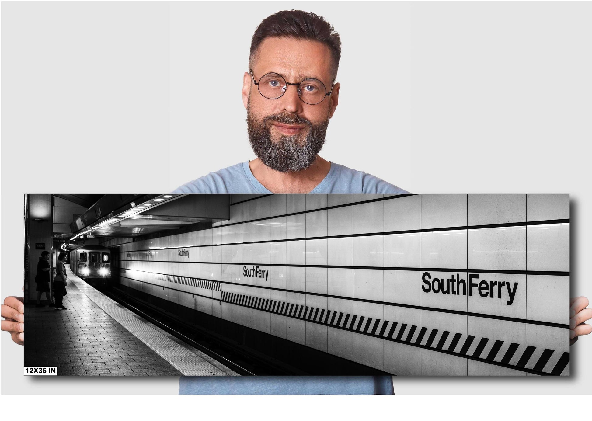 Capture the timeless essence of New York City with this dramatic black-and-white photograph of the South Ferry Subway Station. Located at the southern tip of Manhattan, South Ferry is a key hub for commuters and tourists alike, offering access to the Staten Island Ferry and the Battery Park area. Originally opened in 1905, the station has undergone various transformations, with the most recent version of the South Ferry Station unveiled in 2009, featuring modern design elements and improved infrastructure.