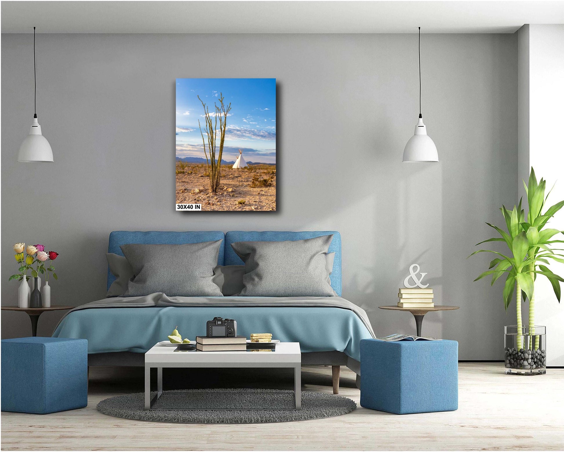 Experience the beauty of the Big Bend area in Texas with this stunning fine art print, showcasing an ocotillo plant standing tall against a vast desert landscape. In the background, a traditional teepee adds a touch of serenity, while the dramatic Chisos Mountains loom in the distance. Located just outside Terlingua, this area is known for its rich history, rugged beauty, and connection to the Old West. Once a mining town, Terlingua now attracts travelers seeking the solitude of the desert, the beauty of Big Bend National Park, and the sense of adventure that this iconic region offers.
