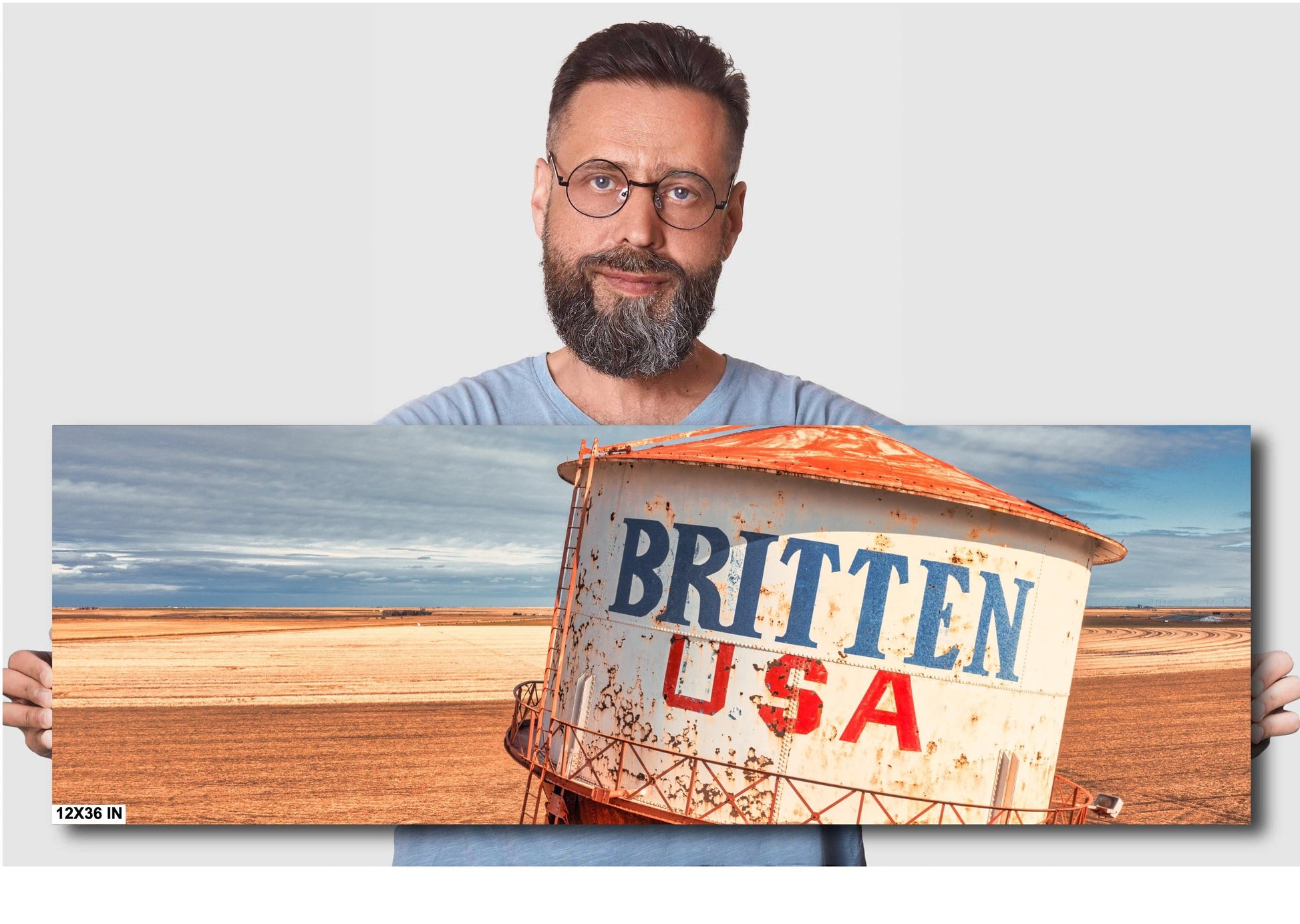 This unique photograph captures the famous Leaning Tower of Britten, a beloved roadside attraction along Route 66 near Groom, Texas. Originally a functioning water tower, it was purchased in the 1980s by Ralph Britten, who tilted it deliberately as a way to draw attention to his truck stop and restaurant, which once stood nearby. The tower has since become an iconic Route 66 landmark, known for its quirky, precarious lean that captivates travelers from around the world.