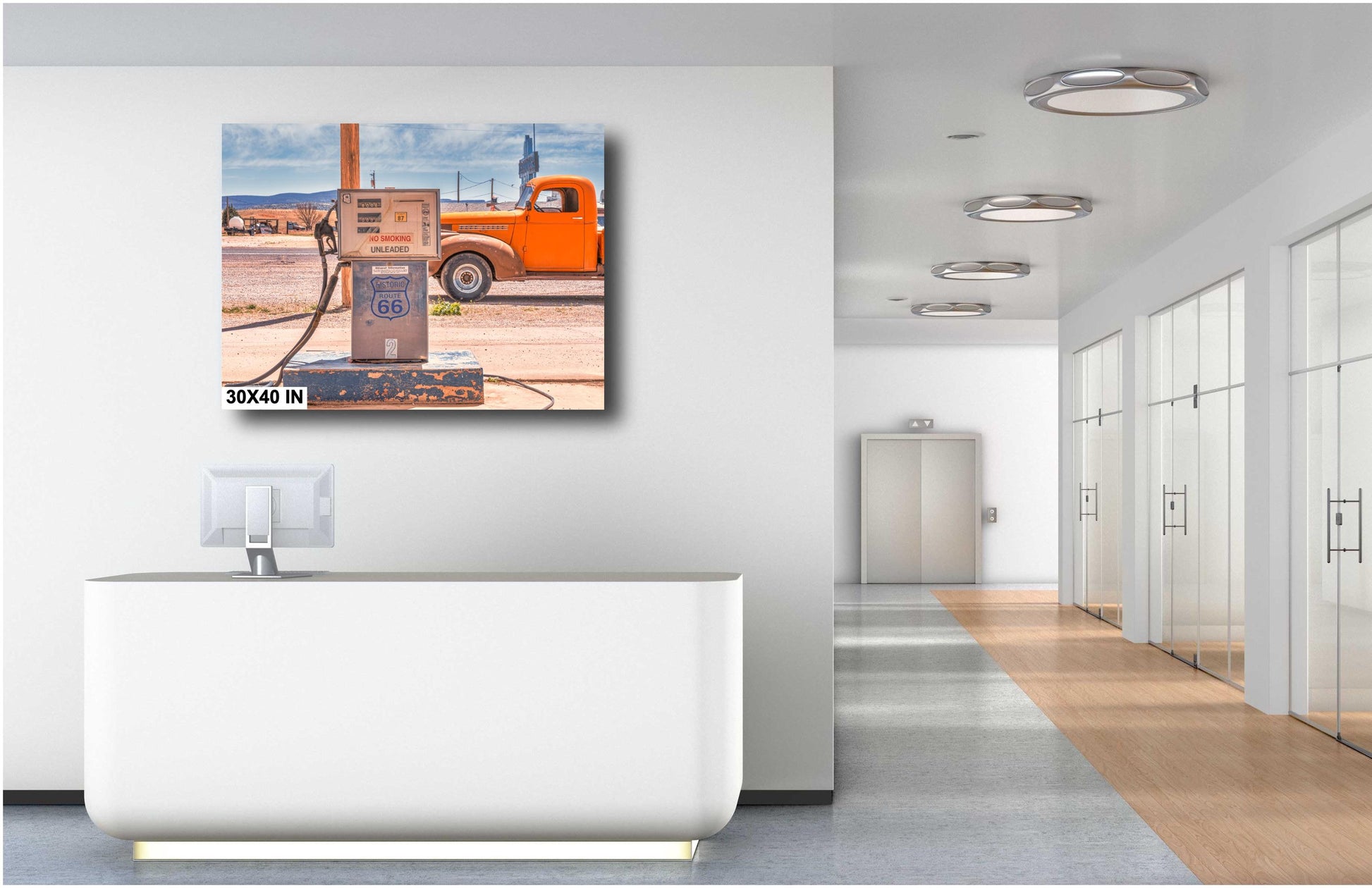 Vintage 1940s Chevrolet Pickup Photograph on Historic Route 66 - Rustic Western Gas Station Wall Art