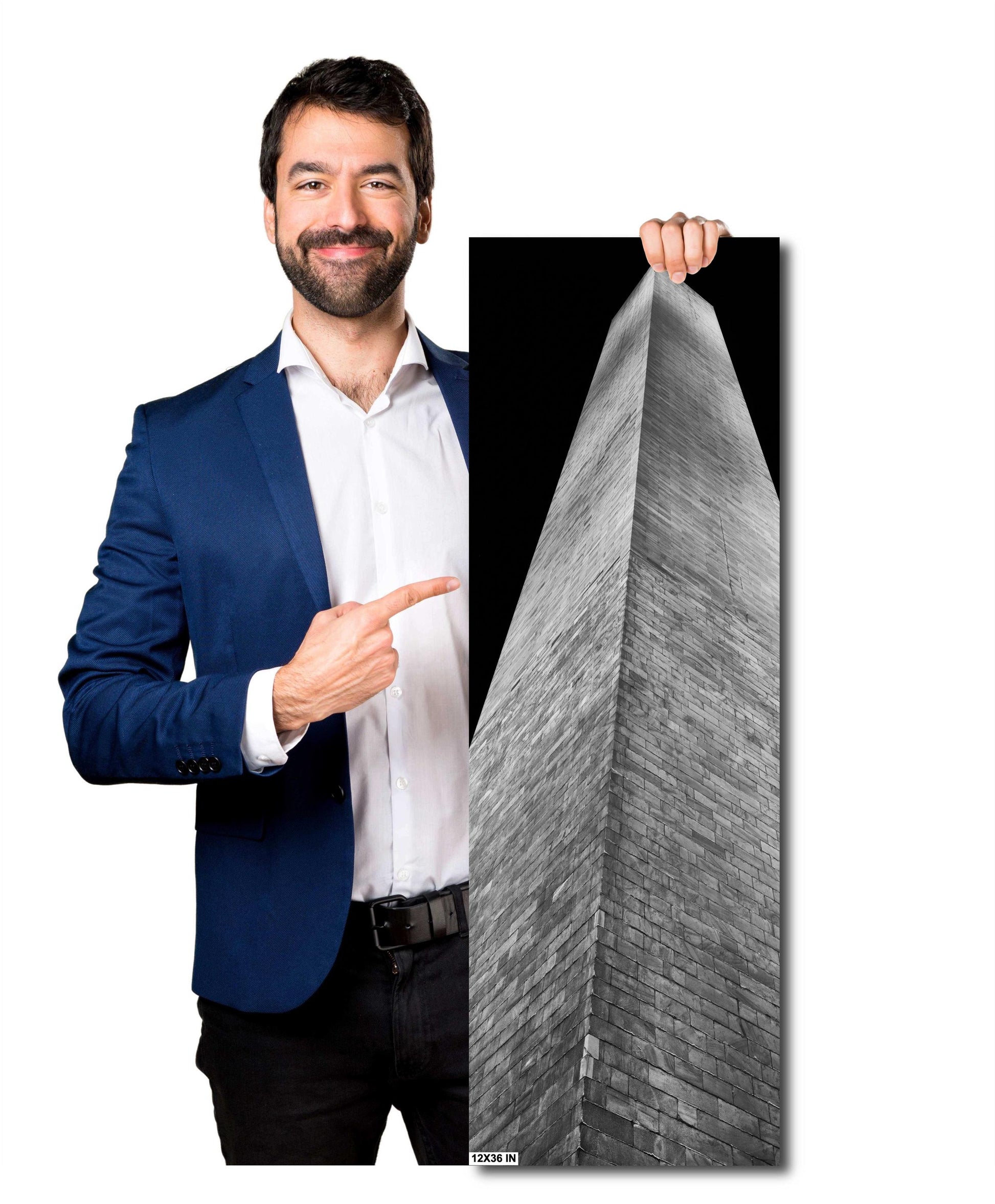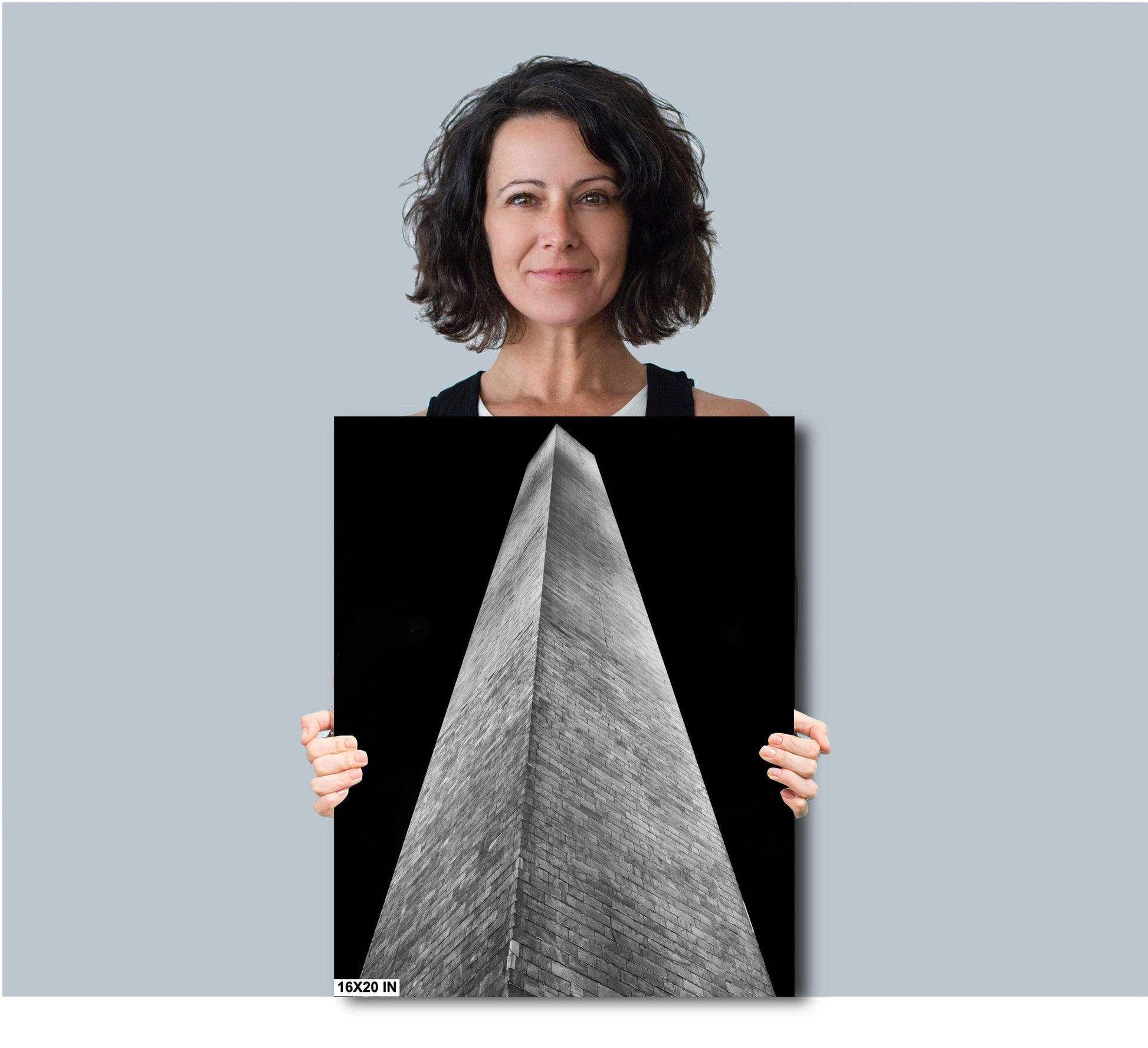 This striking fine art print features an upward view of the Washington Monument in dramatic black and white. Captured from a unique angle, this image accentuates the height and grandeur of the towering structure, symbolizing the lasting legacy of the nation's first president, George Washington. The sharp lines and textures of the monument stand out against the deep, dark sky, creating a powerful visual contrast.